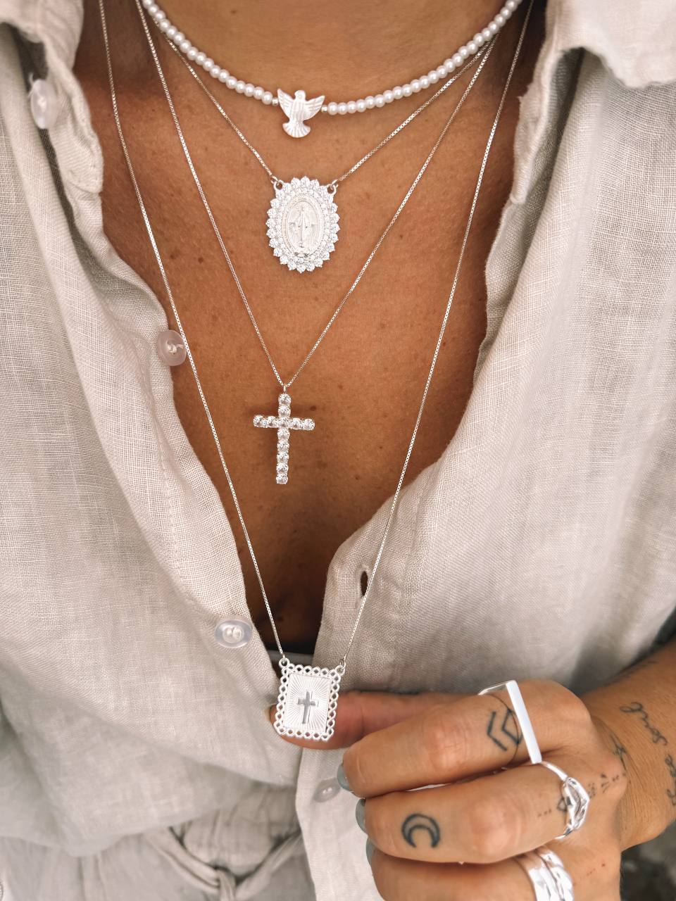 Gargantilha de pérola com Espírito Santo em madrepérola.
